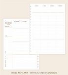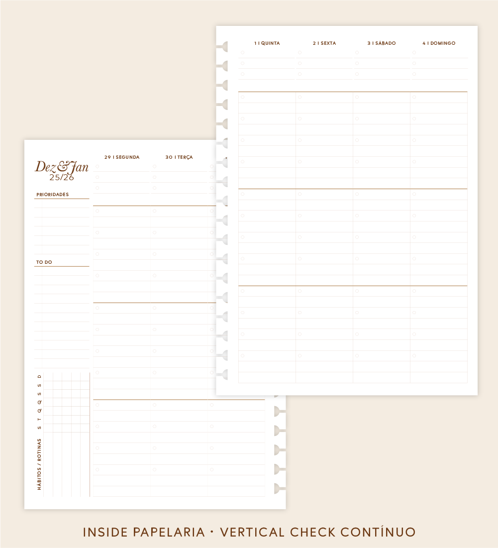 - 1 página de rosto e 106 páginas de planejamento semanal (vertical check) com meses contínuos (não possui separação entre os meses).