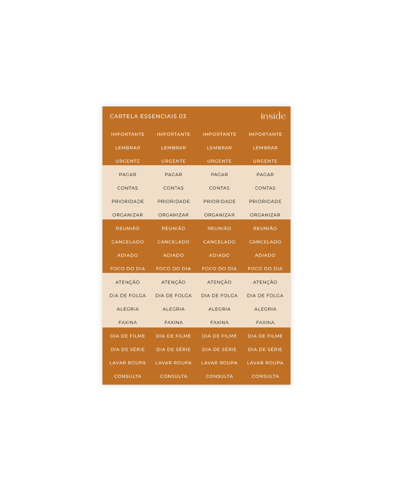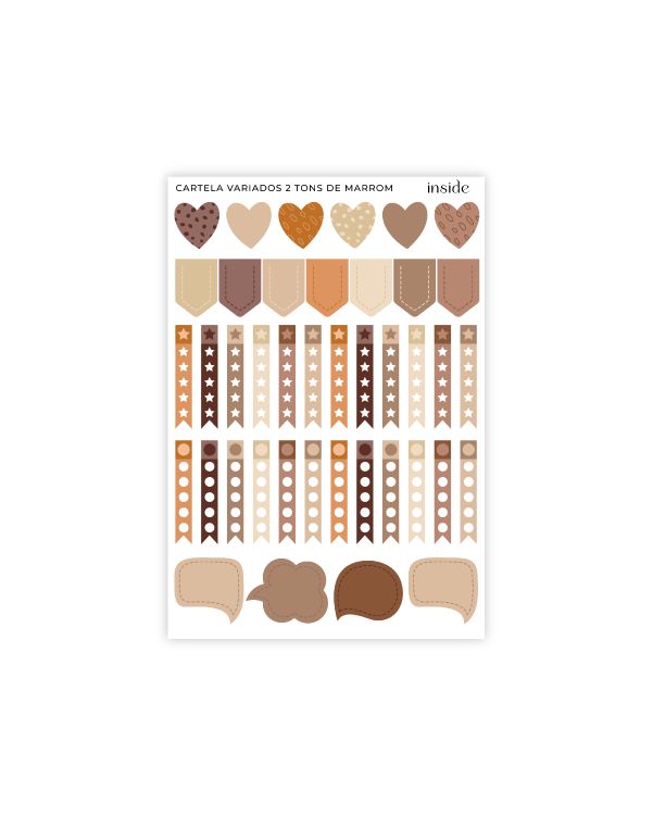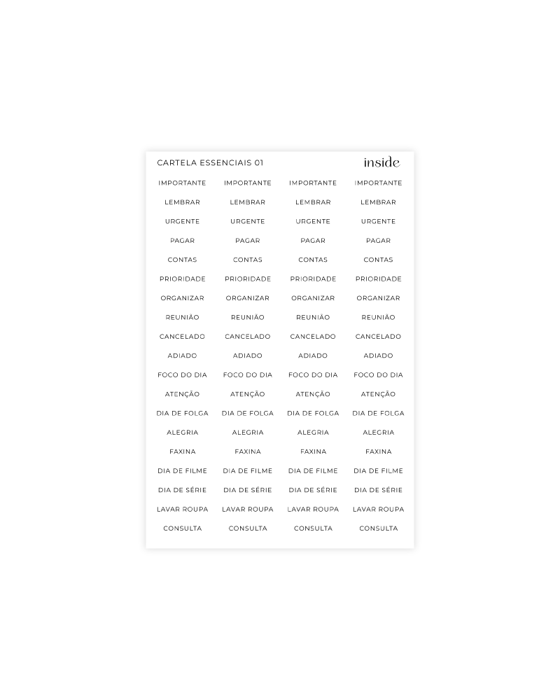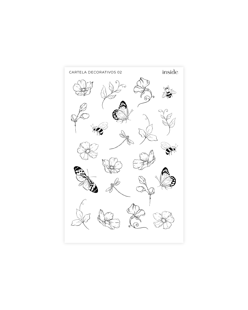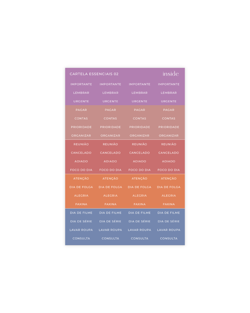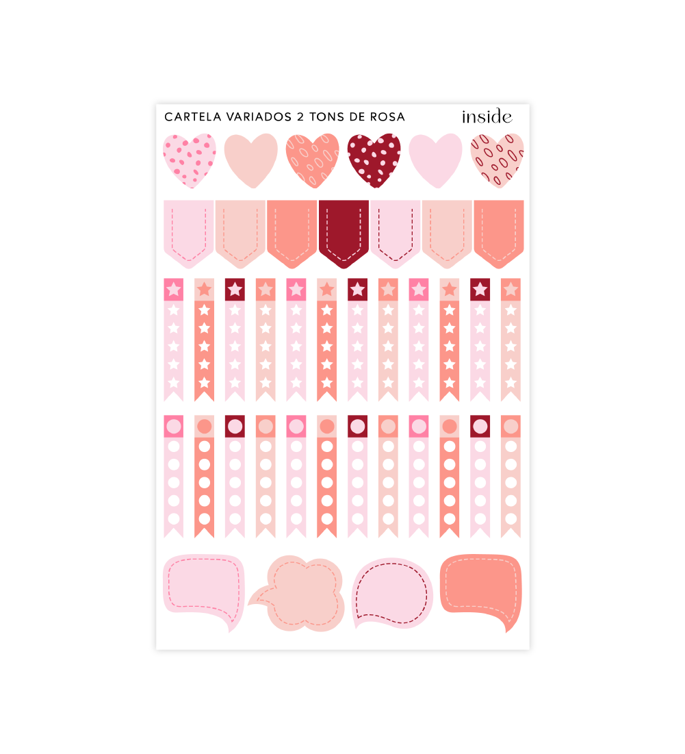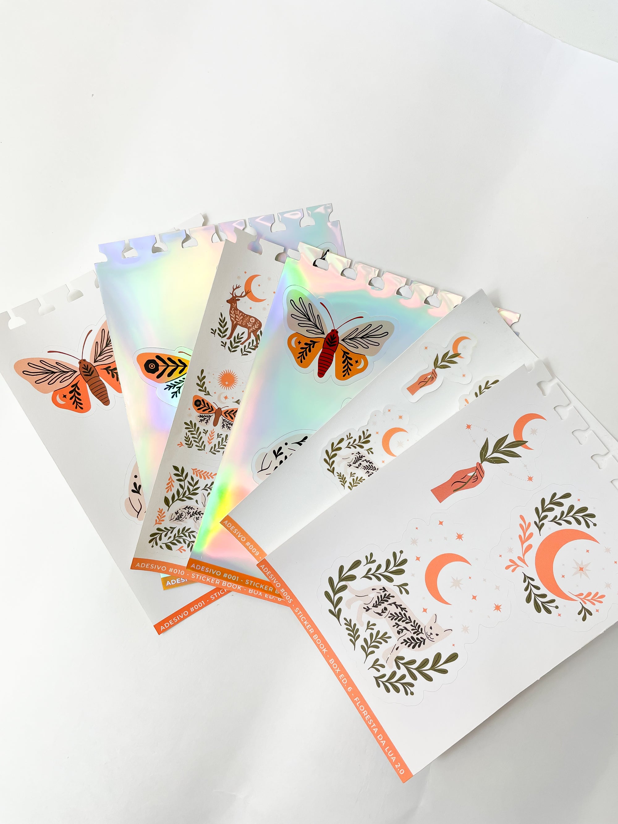 Nossas cartelas de adesivos são bem grandes — um pouco menores que uma folha A5, tamanho estratégico para que caibam nos bolsos dos cadernos Mini e Colegial. Você pode escolher qualquer uma entre 5 opções de tipos de papel: Comum, Transparente, Pólen, Holográfico e Estrelas Holográficas.