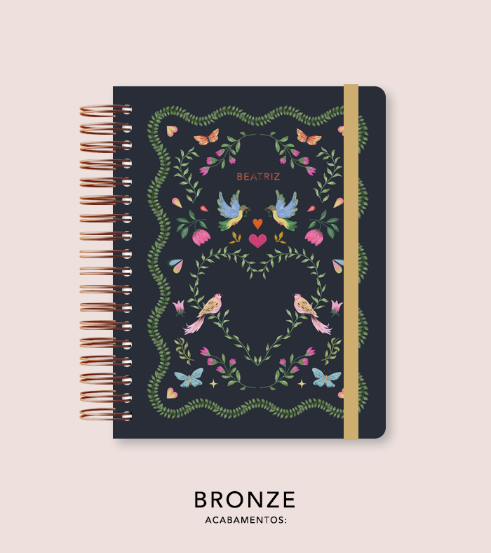- Acabamentos Metálicos: Escolha a cor do Wire-O e adicione cantoneiras que, além de protegerem as quinas do seu caderno, conferem um visual refinado e profissional.