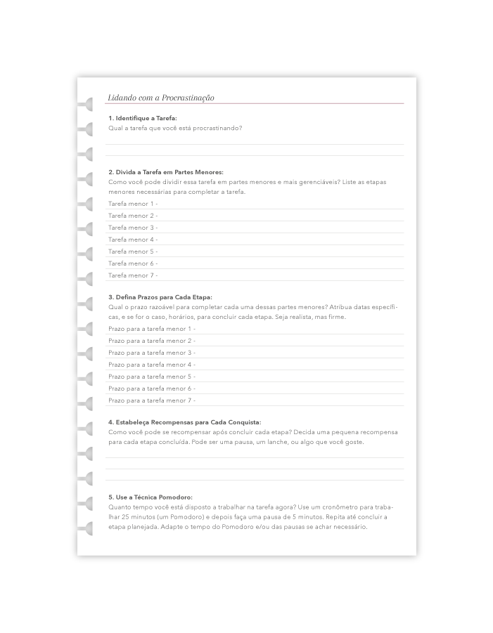- 2 páginas "Lidando com a Procrastinação" que se repete 24 vezes na versão "25 Folhas" ou 49 vezes na versão "50 Folhas".