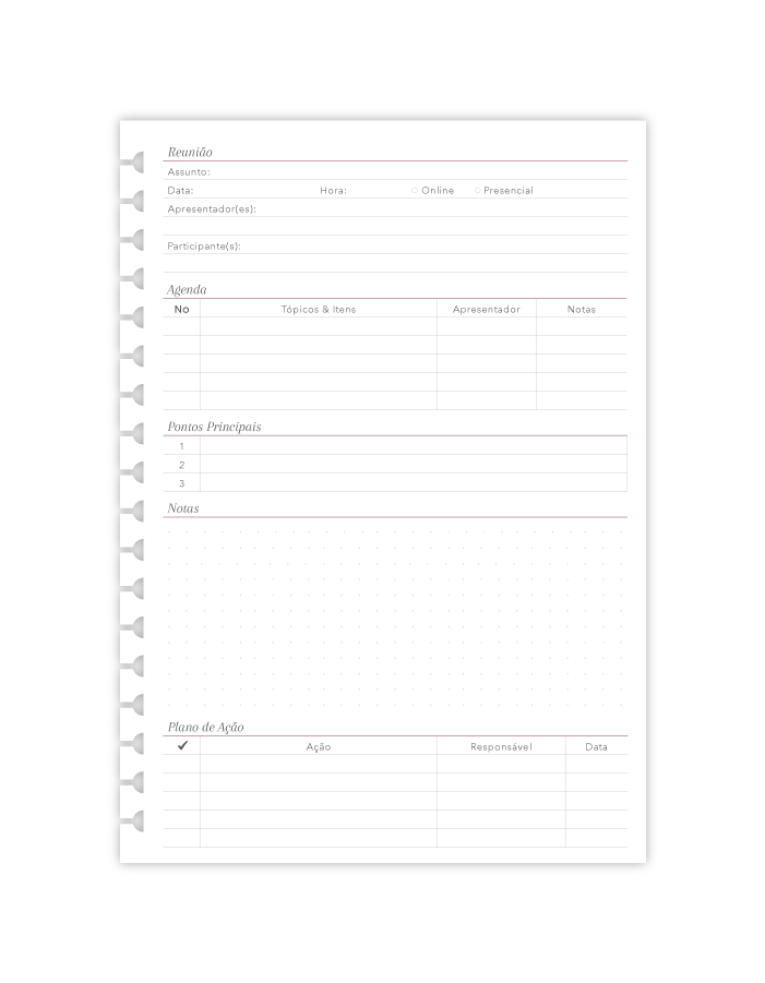 - Mini A5 (15 x 21 cm), com 16 furos.