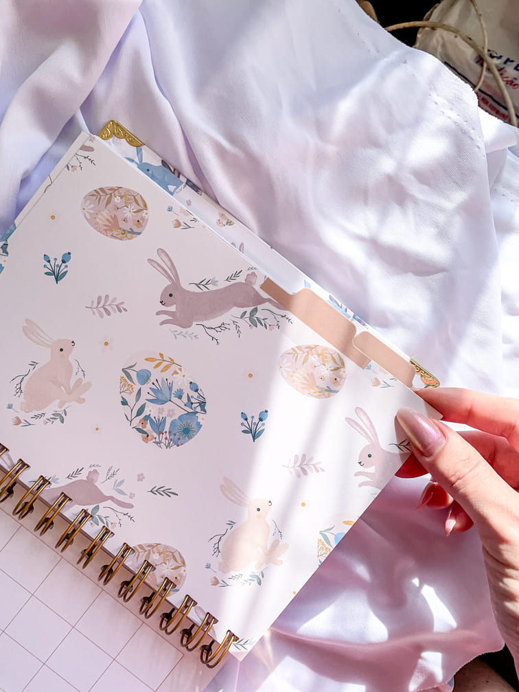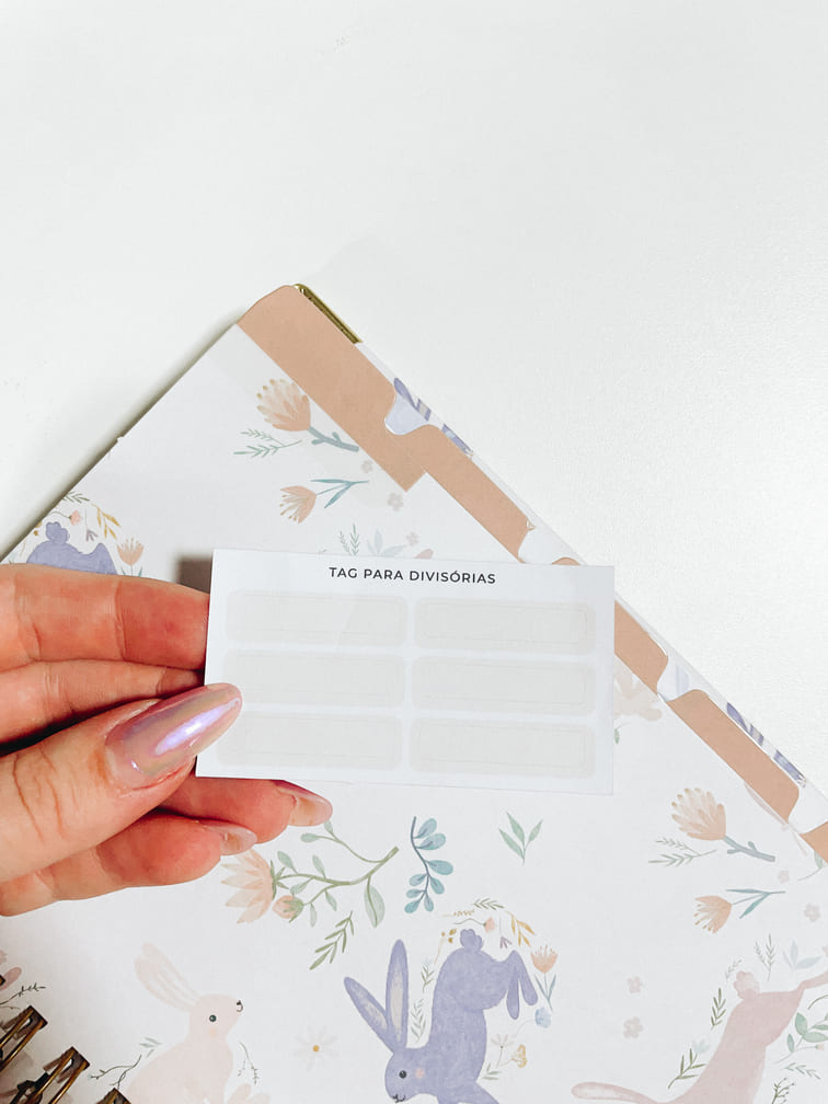 - Acompanha: capa + contra capa com elástico, 1 folha inicial com instruções, 100 ou 150 folhas (você escolhe no formulário de personalização), 1 envelope de papel (feito em papel 180g/m²), na mesma estampa da capa ou coleção, 6 divisórias reposicionáveis (feitas em papel 180g/m²) com abas plastificadas na mesma estampa da coleção e 1 kit com 6 adesivos "tag para divisórias", para escrever e colar nas abas.