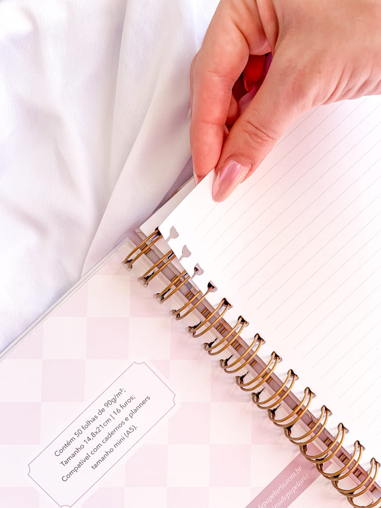 - Folhas de 10,5x14,8cm, com gramatura de 90g/m², reposicionáveis, com 11 furos. Por serem presas por vários anéis, não soltam com facilidade.